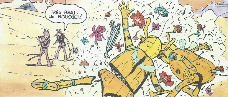 Souvenir d’enfance que cette bande dessinée que je viens de relire. Enfant, j’avais été très impressionné par les Zombs, ces robots au sourire exagéré, par la planète aux automates du vilain Toï-maker (le faiseur de jouet), par les tenues très « Yellow Submarine » de Agar et Zarra. L’histoire avait été pré-publiée dans l’éphémère mensuel Lucky Luke. A la relecture, j’ai retrouvé le plaisir de mes souvenirs d’enfance. Le dessin, l’histoire, les costumes et les décors sont très marqués par l’univers psychédélique des années 70. Le scénario est fantaisiste, poétique, un peu magique, bien loin de la science fiction réaliste de la décennie suivante. En fait, c’est un véritable bouquet d’images colorées, à la mode hippie, que nous offre « Les jouets maléfiques », premier opus des aventures de Agar et Zarra. A relire ou à découvrir pour ceux qui n’ont aucun souvenir des années 70.