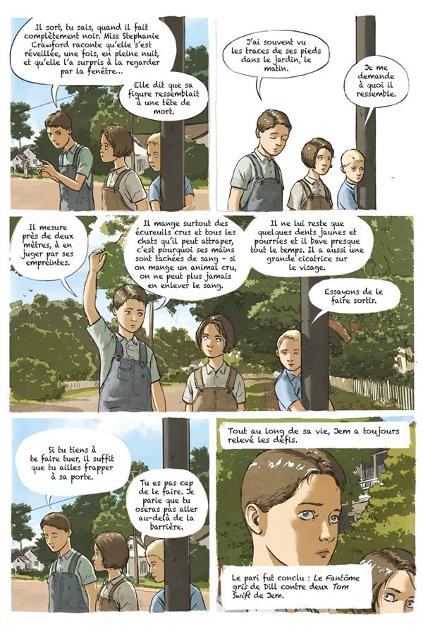 Difficile d’adapter un roman de la littérature américaine couronné d’un prix Pullitzer et pourtant l’exercice est plutôt réussi. Fred Fordham reste très proche du texte original, n’adaptant le roman de Harper Lee que pour rendre plus clair le roman graphique. Le dessin de Fordham est sobre, tel un manga, sans fioriture, mais très précis, plein de détails qui nous transportent dans l’atmosphère des États-Unis des années 1930. On y découvre, tel un film d’époque, l’architecture de la ville, les habitations des populations noires et blanches, la manière de s’habiller, les intérieurs, les activités des habitants de cet Alabama. Les portraits dessinés par Fred Fordham retranscrivent parfaitement les relations humaines au sein de la famille d’Atticus, les états d’âme de Scout et l’insouciance de sa jeunesse, le passage à l’âge adulte de Jem. Il décrit également avec habileté l’abandon des populations déclassées, blanches et noires qui sont les acteurs de la trame de fonds de cette histoire. A lire avec intérêt et plaisir, pour ceux qui connaissent l’oeuvre d’Harper Lee, et une invitation de découvrir cette oeuvre avant de se plonger dans la lecture de l’originale pour les autres.
