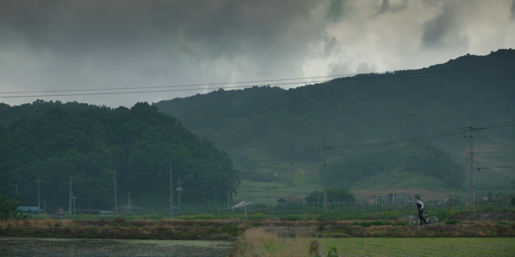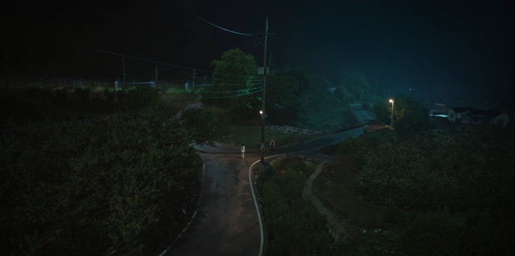 Au loin elle voit une lumière de phare et sur le plan suivant on voit Ji-won arriver. C’est une scène tout en regard point de vue, elle regarde, elle voit ce que l’on voit. Ici une tache lumineuse en mouvement.