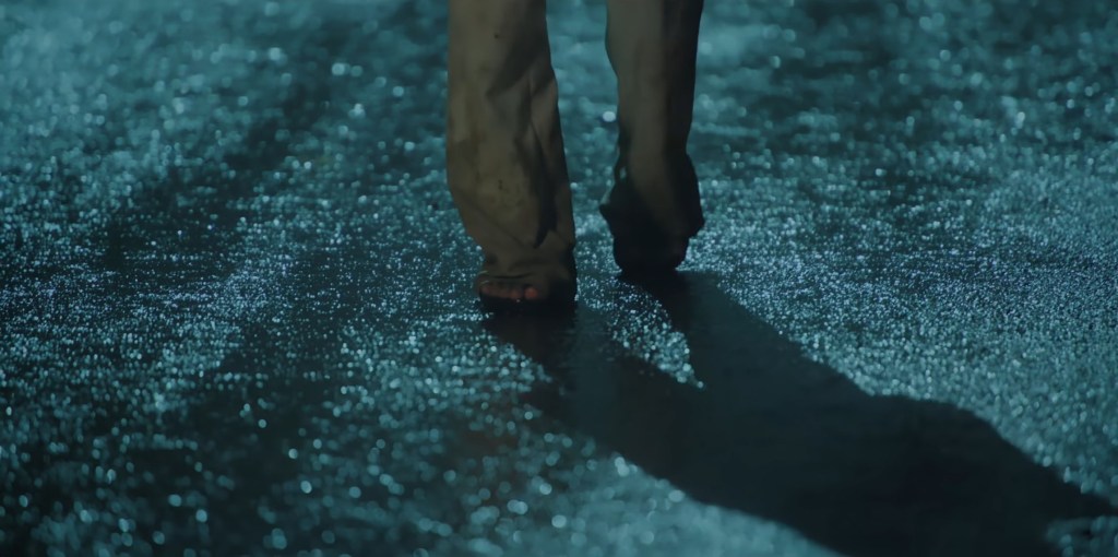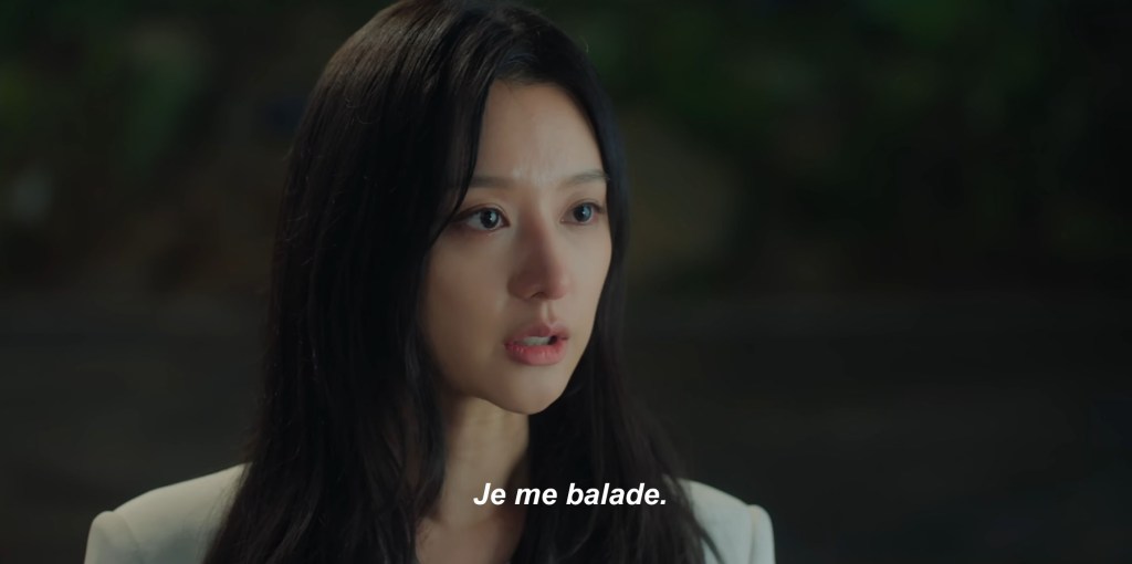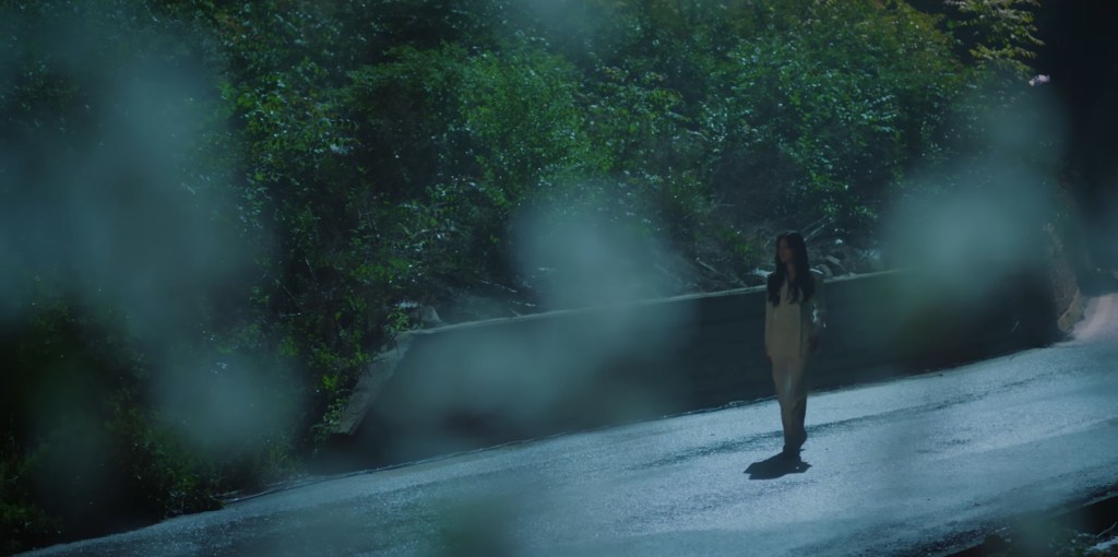 C’est la fin de la journée, la nuit arrive. On la retrouve, floue puis nette. Ce n’est pas Hae-in qu’on connaît, toujours tirée à quatre épingle, sûre d’elle-même. Elle marche seule sur la route, son regard est absent, ses vêtements sont tâchés de terre.