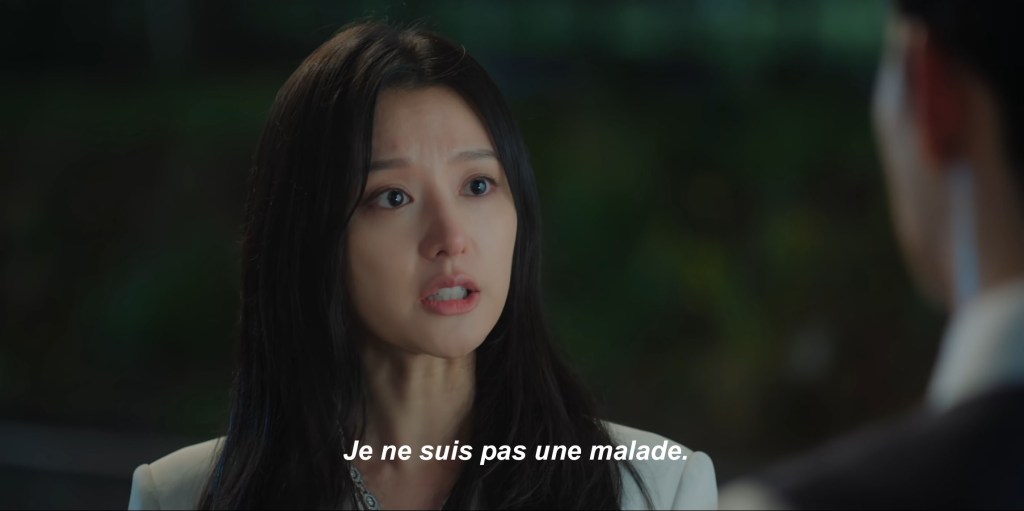 Lui semble furieux, lui qui d’habitude évite la confrontation, l’interroge avec vigueur. Ce n’est pas l’Hae-in que l’on connaît, elle semble perdue, tente de lui répondre mais n’argumente pas. Une discussion de gros plan à gros plan. Cependant, elle reste de marbre lui envoyant à la figure “Je ne suis pas une malade”. Dès lors, il sait qu’elle ne baissera pas les armes et choisit le repli. Les plans s’élargissent. Alors que les gros plans donnaient l’impression d’une discussion proche, les plans plus larges accroissent la distance entre eux.
