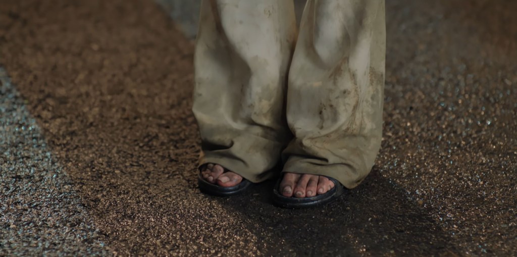 Le choix de mettre en avant des détails tels que le sol, la lumière des réverbères, ou encore des éléments de costume (son col, sa manche, son pantalon taché) donne au spectateur l’impression d’une intimité fragmentée, révélant ainsi l’état d’esprit des personnages. La manière dont les plans se déplacent de gros plans intimes à des plans larges, accentuant la solitude et la tension, renforce l’aspect dramatique de la scène.