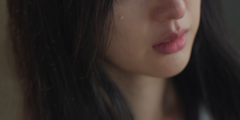 Elle finit par lui parler : “En fait, je…”Un moment d’indécision : Ji-won se retourne mais les deux personnages ne sont jamais nets en même temps, puis c’est à son tour de la regarder : ses pieds et son pantalons tâché, sa blessure à la jambe, son poing serré, sa bouche, alors qu’elle explique ce qui lui est arrivé, son regard à lui redevient humain. Les gros plans sont de mise. Et le jeu de Kim Ji-won est plein de justesse et de sensibilité, elle vient de prendre conscience de sa maladie.