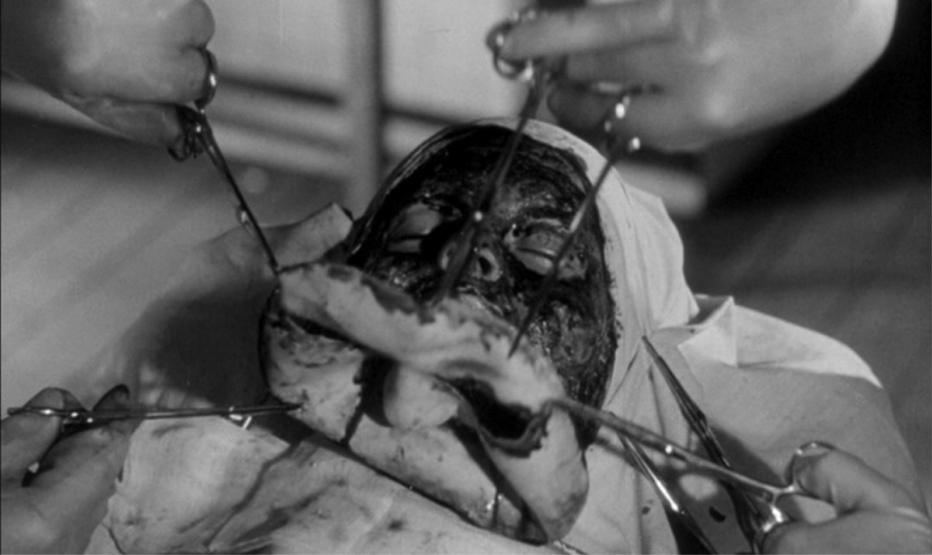 D’abord visuellement. Comme chez Franju, la mise en scène joue sur le contraste entre la blancheur clinique de la science et une imagerie presque irréelle, parfois gothique. Les salles d’opération y sont filmées avec un soin maniaque, presque fétichiste, mais toujours avec une tension sourde. Les personnages évoluent souvent dans des décors aseptisés où l’angoisse monte sans éclats, comme dans un cauchemar retenu. Il y a des couloirs vides, des masques chirurgicaux figés, des visages inexpressifs (sauf quand Park Eun-bin s’apprête à opérer, ses yeux illuminent le plan), des plans fixes très composés — autant d’éléments qui rappellent l’ambiance hypnotique et troublante du cinéma de Franju. Il y a même les chiens…